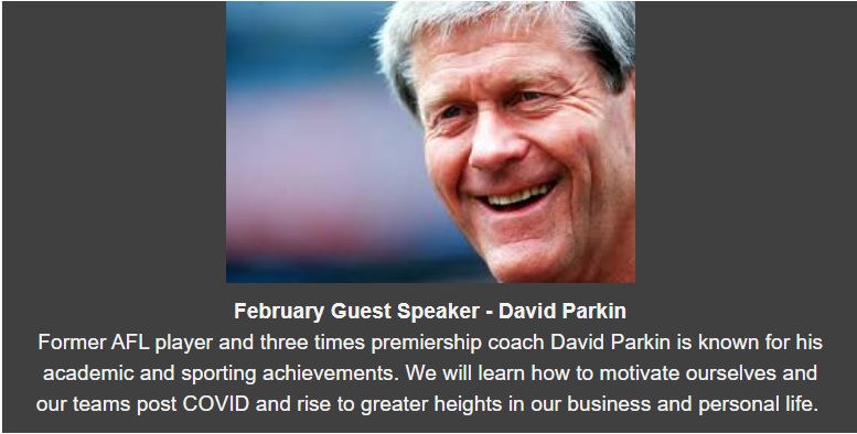 We have secured David Parkin who is one of Australia’s most inspirational and motivational corporate speakers. I am really looking forward to finally seeing you again and welcoming you back to the Club.